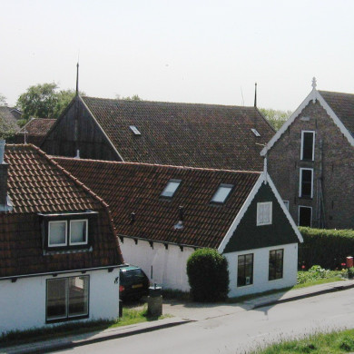 Langgerekte, wellicht vroeg 20e eeuwse SCHUUR, geheel opgetrokken uit hout, met staand beschot en inwendig een uit scheepshout samengestelde draagconstructie, onder pannen zadeldak tussen puntgevels met eenvoudige topmakelaar aan de Z. zijde.