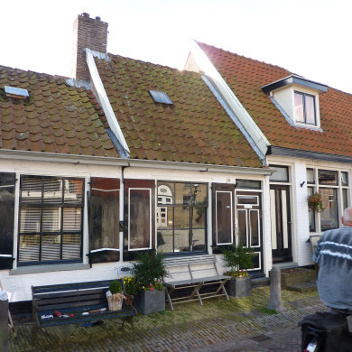 Klein huisje onder een dwars dak met de nummers 8 en 12. Aardige details aan vensters. Luiken en goede deur. Achterschot.