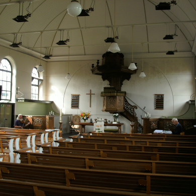 Hervormde Kerk. Classicistische zaalkerkje uit 1835 met torentje boven de voorgevel. Rijk gesneden midden 18e eeuwse preekstoel afkomstig uit de Engelse Kerk in Den Haag, met trap, ruggeschot; klankbord met vlampotten; doophek XVIII A. Eenklaviers mechanisch orgel, gemaakt door F.G. Leichel in 1879 in een kas uit de eerste helft van de 18e eeuw. Niet onder de bescherming vallen de latere toevoegingen en wijzigingen aan het pijpwerk.