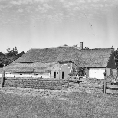 Fraai tegen de rand van het dennebos gelegen boerderij met dubbel hooivak en inritten aan de lange zijden; uitgebouwd woonhuis met houten top.