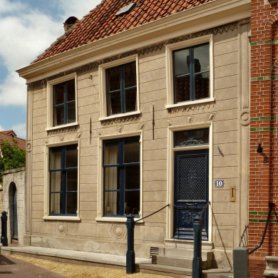 Gepleisterd pand, wellicht uit de 17e eeuw, bestaande uit een gedeelte met verdieping en schilddak, evenwijdig aan de straat en een achtervleugel loodrecht hierop, onder zadeldak tegen puntgevel met vlechtingen. Lager achterhuis met lage verdieping en schilddak. De voorgevel, met blokbepleistering, geprofileerde vensteromlijsting, kroonlijst en deur met roosterwerk, versieringen en bovenlicht, dateert in de huidige vorm uit het derde kwart van de 19e eeuw. Stoep met stoeppalen. Inwendig een tongewelfde kelder, stucplafond uit het derde kwart van de 19e eeuw, een keuken met eenvoudige betimmeringen, balkenplafond en tegels, alsmede een tegelwand uit de 17e of 18e eeuw.