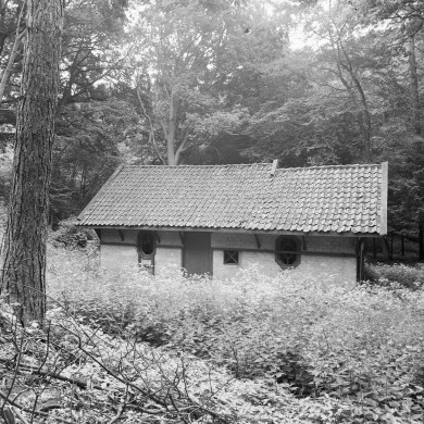 FAZANTENHUIS. Gebouw op T-vormige grondslag onder met pannen gedekte zadeldaken en bestaande uit het voorm. fazantenverblijf met ren en enkele vertrekken waaronder met stookplaats. Aan de voorzijde gevel met houten stijlen die gelobde bogen vormen en gaas. In de achtergevel o.a. gerekt-achthoekige venster in omlijstingen (tweede helft negentiende eeuw).