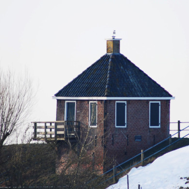 CONTRIBUTIEHUISJE gebouwd in 1828 en voorzien in 1855 van een mechanische windrichting-installatie, gelegen op de dijk van Rintjehoek bij Kollumerpomp.