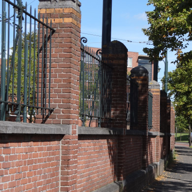 OMMURING MET HEKWERKEN. Aan de zijde van Parallelweg en Ter Borchstraat bewaard gebleven ommuring rondom het remiseterrein. In baksteen opgetrokken muur met voetinghek met gemetselde pijlers en met siersmeedijzeren hek bij de ingang naar de dienstwoning.