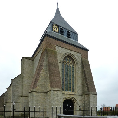 Op omheind kerkhof gelegen rijzige kerk waarvan het koor en het dwarspand zijn afgebroken en waarvan het basilikale schip over is benevens een traptoren en enig muurwerk van het dwarspand. XVI A.