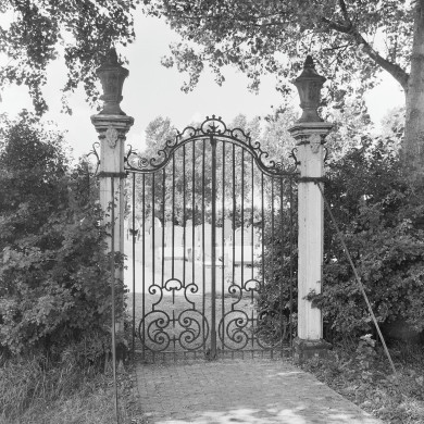 Toegangshek tot begraafplaats. Een uit de eerste helft van de 18e eeuw daterend hek bestaande uit pijlers bekroond met siervazen alsmede een fraai smeedijzeren hek.