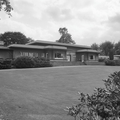 HOOFDHUIS. De op een langgerekte plattegrond zonder verdieping opgetrokken villa bevindt zich op een verhoogd gedeelte van het rondom tot tuin ingerichte terrein en wordt afgedekt door een samenstel van platte daken met overstek, waarbij een smallere luifel aan de onderzijde nog meer oversteekt dan de hogere lijst daarboven, die alle sprongen in de plattegrond volgt.