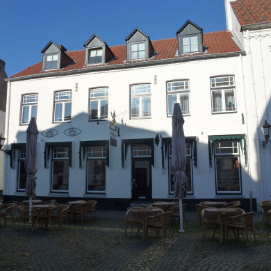 Hoekpand met verdieping en zadeldak, in oorsprong 16e eeuws. Puntgevel met zaagtandfriezen opzij, gepleisterde voorgevel van 19e eeuws karakter. Op de hoek een gietijzeren arm met lantaarn.