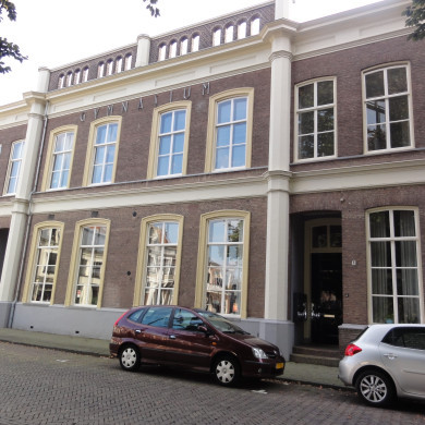 Gymnasium. Pand met verdieping, ter breedte van 10 vensterassen. De lijstgevel, daterend uit omstreeks 1860. wordt door veelhoekige, gepleisterde muurzuilen in drie delen verdeeld; tussen de parterre en de verdieping een gepleisterde cordonlijst. Flauw gebogen vensteromlijstingen, waarin de oorspronkelijke acht- en zesruitsschuiframen. Bakstenen borstwering met boogvormige openingen boven de middenpartij.