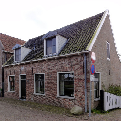 Woning onder zadeldak tussen topgevels; zesruitsvensters en boven ingang met oude deur en jaartalsteen 1768.
