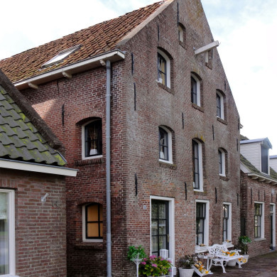 Pakhuis met verdieping en zolderverdieping onder zadeldak, tussen topgevels.