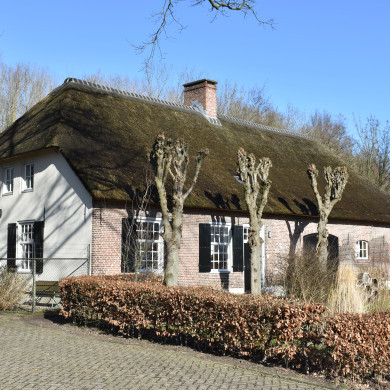 Hoeve van het Brabantse langgeveltype, begin 19e eeuw, onder rieten wolfdak. Vensters met luiken en 20-ruitsschuiframen.