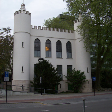 Paleis-Raadhuis. Voor koning Willem II in 1847-1849 gebouwd paleis in Engels romantische stijl. Gepleisterd rechthoekig gebouw met vier ronde hoektorens en aan de lange zijden uitspringende middenpartijen. Oorspronkelijk met kantelen, rechthoekige vensters en attiek met vensters; in 1895 verbouwd, nogmaals ingrijpend gewijzigd in 1934, toen de huidige spitsboogvensters aangebracht zijn. Twee vrijstaande lantaarns voor de achtergevel.