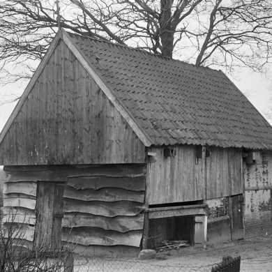 Gaaf eenbeukig vakwerkschuurtje; vakvulling van baksteen, hout en twijgen met leem.