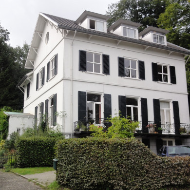 "Heuvelrust", karakteristiek tegen de heuvelflank in de zichtas van de straatweg gelegen wit gepleisterde villa met vijf traveeën brede voorgevel. In het drie traveeen brede middenrisaliet beganegronds en op de verdieping met balkon openslaande deuren.