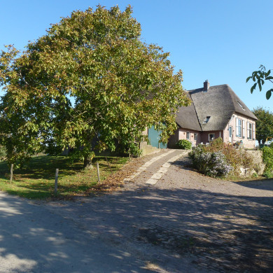 Gepleisterde boerderij, zeventiende of achttiende eeuw, met het door een rieten schilddak gedekte woongedeelte dwars voor de stal. Tegen de zijgevel van de stal een vleugel onder rieten schilddak.