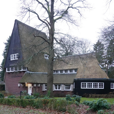 In 1924 naar ontwerp van zijn zoon F.E. Rontgen - en blijkens gevelsteen ook van de architecten Hoenink en Gathier - ten behoeve van de musicus Julius Rontgen in Amsterdamse School-trant gerealiseerd landhuis, genaamd Gaudeamus, met in hoogte en vorm varierende bouwvolumes opgetrokken in baksteen en hout onder samenstel van rieten kappen op een aan de vorm van een concertvleugel herinnerende plattegrond.