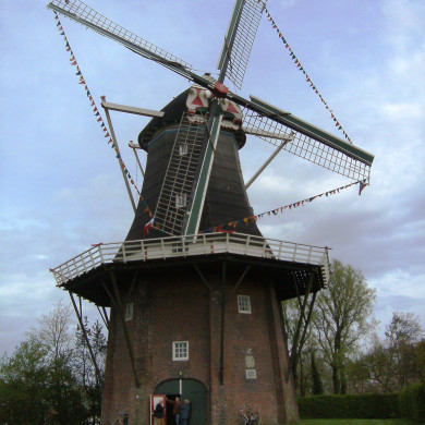 Molen Eva. Achtkante bovenkruier met stelling. In het stenen onderstuk stichtingssteen van de vorige molen Eva uit 1818.