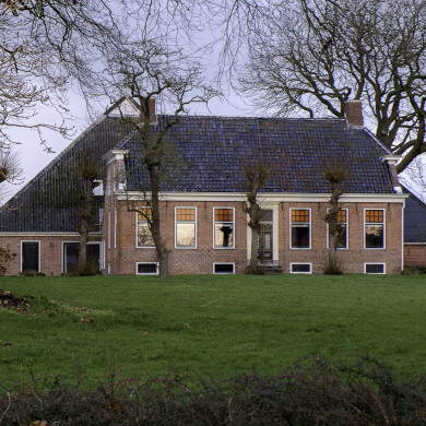 BOERDERIJ van het Oldambtster type met onderkelderd voorhuis en hoge vensters in de afgeknotte voorgevel. Omlijste ingang bereikbaar langs stoep met palen welke door kettingen met de gevel verbonden zijn. Bewerkte deuren en gesneden voorstelling van een leeuw in het bovenlicht.