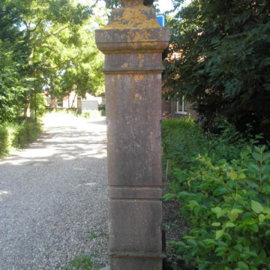 Vrijstaand HEK, bestaande uit twee ver uiteengezette hardstenen pijlers in neo-Lodewijk XIV-trant met gebeeldhouwde muts.