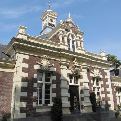 In het midden de door een gebosseerde pilaster-omlijsting en hardstenen stoep met twee leeuwen die elk het gekleurd stadswapen dragen, gemarkeerde ingangspartij met dubbele paneeldeuren en verdeeld bovenlicht, bekroond door een reliëf met wapen en portretbuste van Willem van Oranje.