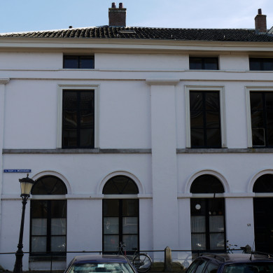 Gepleisterd pand met rechte kroonlijst met strenge neo-classieke vormen.