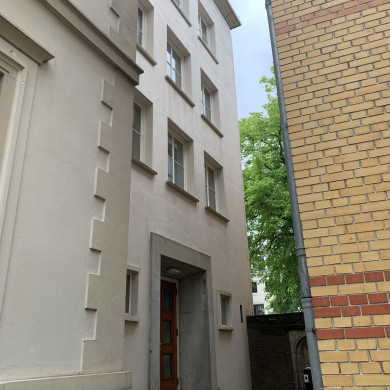 Duitse huis, lage gebouwen deels gepleisterd wapenstenen.