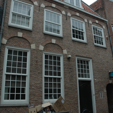 Hoekhuis met trapgevel en rechte kroonlijst. Gemetselde ontlastingsbogen met natuurstenen blokken boven de ramen. Toegangspoortje afkomstig Achter Clarenburg 29.