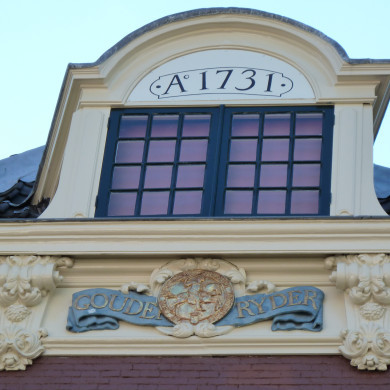 Pand met hoge gevel met rechte kroonlijst met gebeeldhouwde consoles en banderol. Midden XVIII.