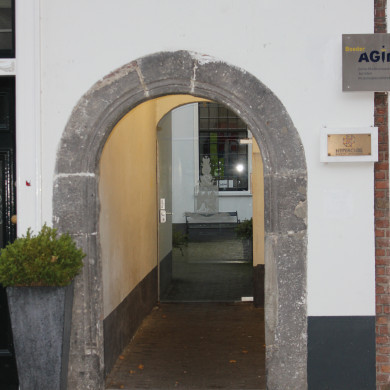 Poortje met gotisch omlijstingsprofiel, in pand nr 13 aanwezig. Op binnenplaats XVII huis met gemetselde gootlijst.