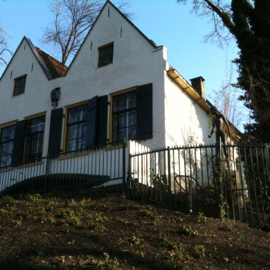 Een 17e eeuws huis van twee bouwlagen met een mansardekap.