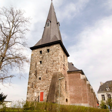 Toren van de vroegere parochiekerk, opgetrokken van ruwe zandsteenblokken, omstreeks 1300. Klokkenstoel met klok van anonieme gieter, 1406, diam. 95 cm.