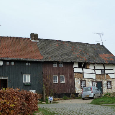 Hoeve van vakwerk, XVIII, met verdieping en een zadeldak met geschoord overstek, gevels met planken bekleed. Bijgebouw met vakwerk en breuksteen, XVIII. Hoeve onder een dak met het buurnummer 13.