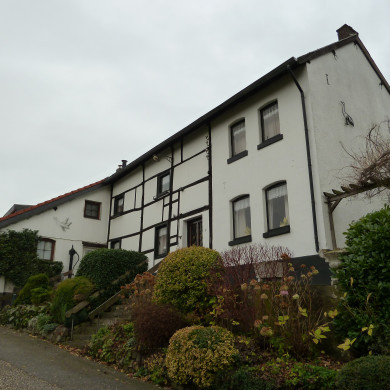 Hoeve, gedeeltelijk van vakwerk, XVIII; eindgevel met planken bekleed.