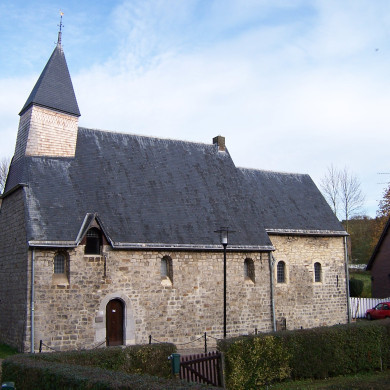 Oude parochiekerk, eenbeukig schip, met dakruitertje boven de westgevel, en smaller recht gesloten koor; opgetrokken van breuksteen, XI of XII (?) het koor later verhoogd en overwelfd. Zerk met jaartal 1719. Grenssteen met dubbele adelaar, tegen zuidgevel van de kerk. Klokkenstoel met klok van anonieme gieter, eerste helft 14de eeuw, diam. 45 cm, buiten gebruik gesteld.
