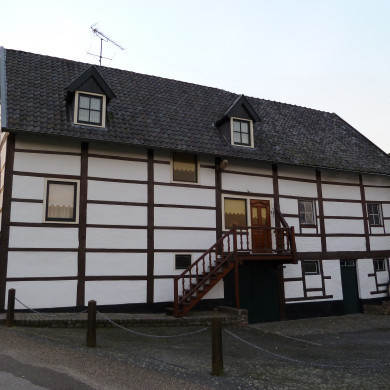 Vakwerkhoeve. Het woonhuis met gave gevel aan de binnenplaats, voorzien van twee aan twee gekoppelde tussendorpelvensters, nog voorzien van glas-in-lood. Ingangsomlijsting met versierde bovendorpel, 1735. Geschoord dakoverstek. Schuur met bakhuis van vakwerk evenwijdig aan het woonhuis.