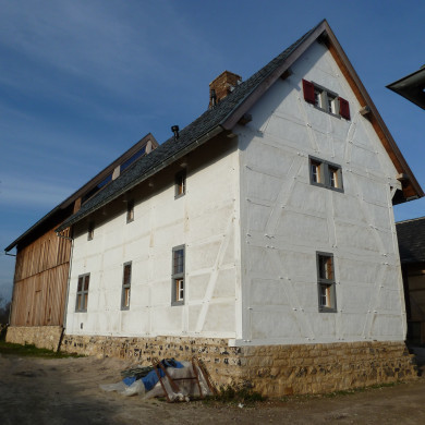 Vakwerkhuis onder vernieuwd zadeldak. Witgeverfd.
