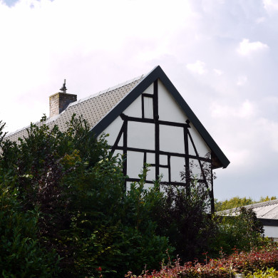 Vakwerkhuis met aan de korte zijde overkraagde verdieping op schoren, afgedekt door een zadeldak. Andreaskruizen. XVII.