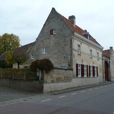 HOEVE van mergel met binnenplaats. In- en uitgezwenkte topgevel met voluten, 1720. Op poortsluitsteen 1723.