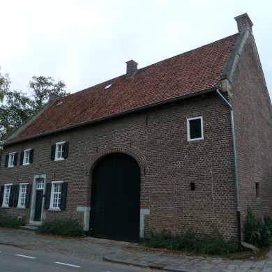 HOEVE van mergel met binnenplaats. In- en uitgezwenkte topgevel met voluten, 1720. Op poortsluitsteen 1723.