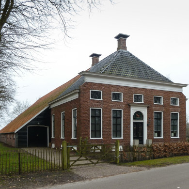BOERDERIJ van het Oldambtster type met twee 'krimpen' aan de zijgevel. Omlijste ingang met halfrond bovenlicht waarin voorstelling van een landman. In het voorhuis achtruitsvensters en een serie zaadzoldervensters in de voorgevel.