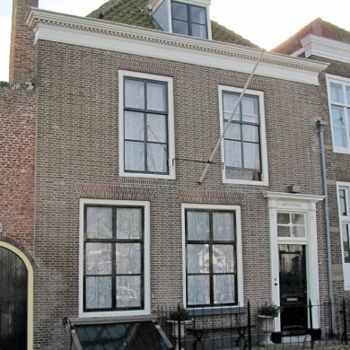 Pakhuis met lijstgevel. Onder de van een tandlijst voorziene kroonlijst twee gebeeldhouwde cartouches met jaartal (anno 1641) en hijsbalk. Toepassing van natuursteen voor hoekblokken, speklagen en waterlijst. Vensters voorzien van kleine roedenverdeling. Sierankers. XVII.
