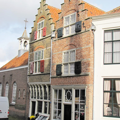 Huis met trapgevel, bekroond door overhoeks pinakel. De treden afgedekt met natuurstenen platen. Natuursteen gebruikt voor speklagen en voor de hoekblokken links. Waterlijst. Boven de vensters met kruiskozijnen ontlastingsbogen van rode baksteen met verdiepte velden. Houten onderpui. Kelderluik.