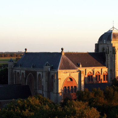 Met de bouw van de hoofdkerk werd in 1479 een aanvang gemaakt door Antonis Keldermans op de plaats van de kerk, die in 1348 tot stand was gekomen en in 1472 tot collegiale was verheven. De bouw werd voortgezet door zijn zoon Rombout volgens contract van 1512. In 1521 kwam de toren op zijn huidige hoogte en in 1543 werd de omgang van het koor overwelfd. De kerk werd in 1597 aan B. de Moucheron verhuurd, brandde in 1686 gedeeltelijk uit, leed in 1809 van het bombardement der Engelsen, die haar vervolgens tot kazerne inrichtte, werd door de Fransen in 1811-1813 tot militair hospitaal ingericht, fungeerde verder als provinciaal bedelaarsgesticht en wordt thans geleidelijk in een betere staat gebracht. Vermoedelijk werd het koor met zijn omgang kort na het voltooien weer afgebroken en werd tegen het dwarspand een lage driebeukige hallenkerk gebouwd, waarvan slechts de midden- en zuiderbeuk behouden zijn. De indrukwekkende. zwaar geschonden kruisbasiliek, welks grondplan twee reeksen vertoont van rechthoekige kapellen, die geopend zijn op de zijbeuktraveeën, is uitwendig geheel met natuursteen bekleed, doch heeft veel van zijn stijlkenmerken verloren door het dichten van de vensters, het teloorgaan der gewelven en het wijzigen van de bedaking. De hoge transeptvensters zijn langs de boogtrommel omgeven door een geprofileerde booglijst, rustende op draagstenen en bekroond door een kruisbloem.