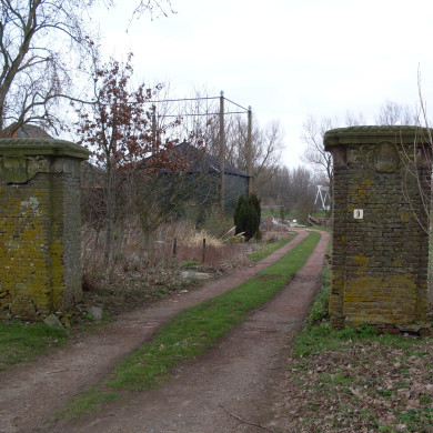 Hek v.m. Huis te Spijk, 17e eeuwse hekpijlers, grachten en aardwerken.