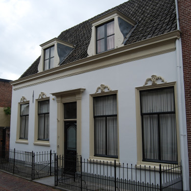 Huis met hoge trapgevel (XVIIb) met in de ontlastingsbogen gebeeldhouwde blokken, geprofileerde waterlijst en dekplaten op de trappen en toppilaster op maskerconsole. Gevelsteen met wapen. Deurpartij en ramen XIX A. Stoep. De gevel is gerestaureerd.