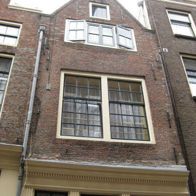 Pand met gevel (XVII) onder betrekkelijk nieuwe punttop. Goede roedenverdeling op de verdiepingen.