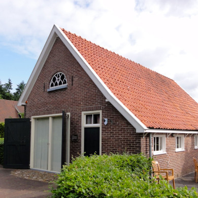 Eenvoudige bakstenen gebouw onder met rode pannen belegd zadeldak, waarvan een schild is doorgetrokken.