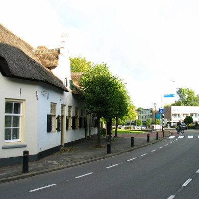 Gepleisterde lage met riet gedekte woning behorend bij serie lage huisjes uit de Dorpsstraat 1/5.