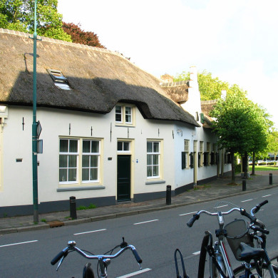 Laag huisje, gepleisterd en met riet gedekt; halve luiken, oude roeden vensters, 17e eeuw.